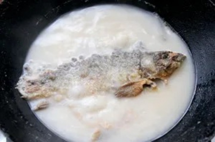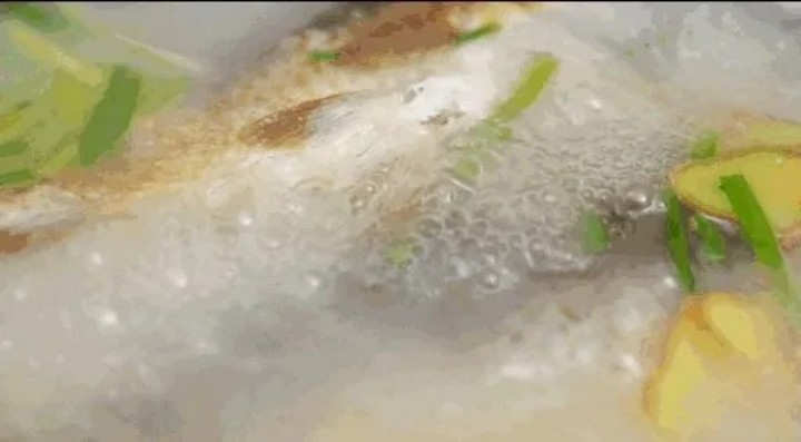 (3)倒入一定量的開水繼續(xù)煮5分鐘,可以看到魚湯慢慢變白,越煮越濃白;