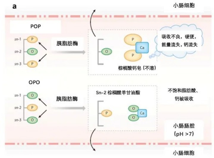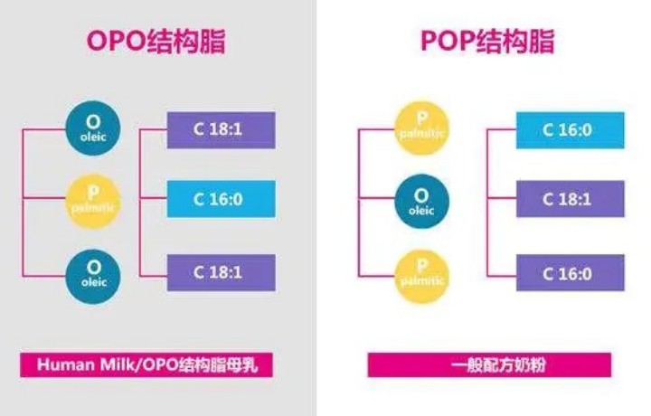其次,母乳中60-70%的棕櫚酸(C16:0)0和油酸(C18:1)結(jié)構(gòu)是以“OPO的結(jié)構(gòu)”,即甘油三酯中一三位是結(jié)合油酸為主,二位結(jié)合棕櫚酸為主,這種結(jié)構(gòu)比我們常見的植物油中的POP結(jié)構(gòu),更適合嬰幼兒消化吸收。
