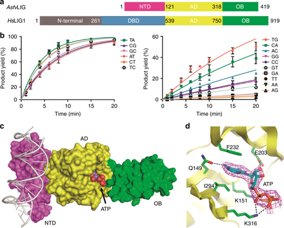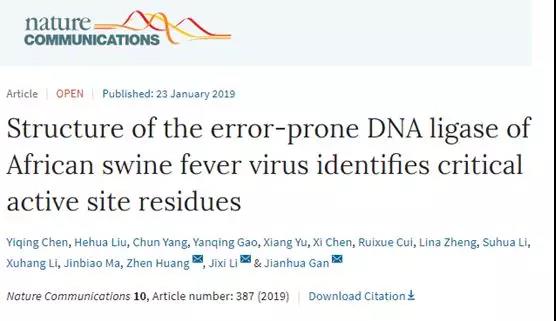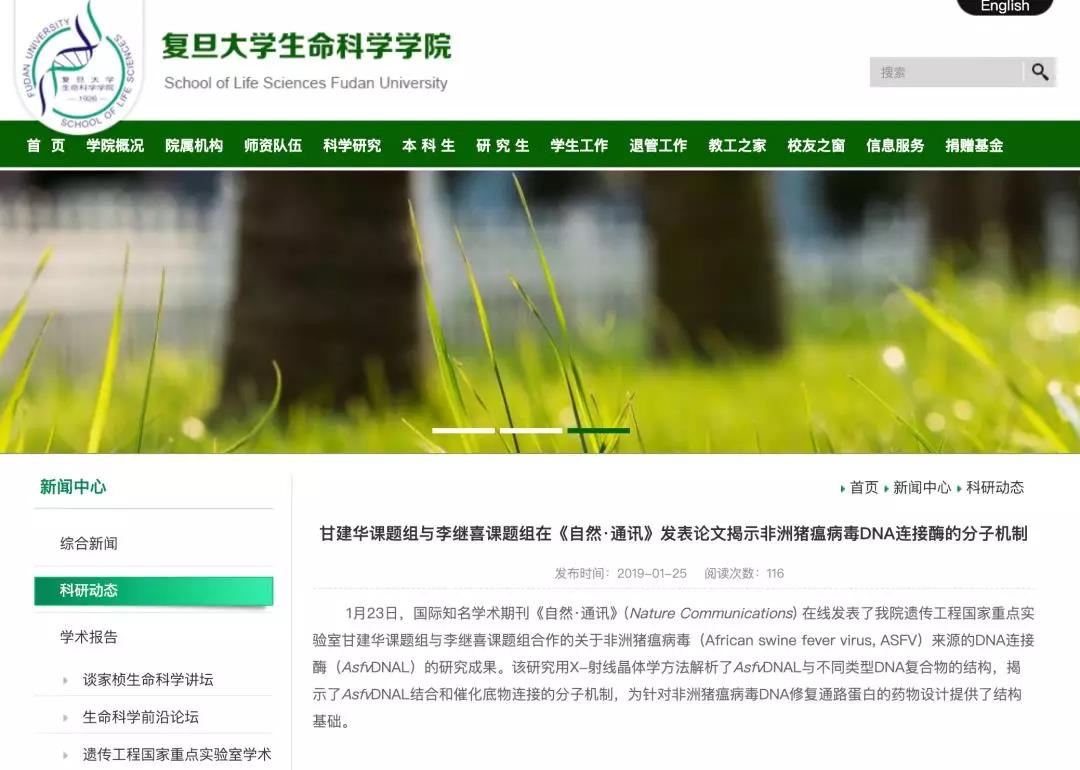 2019年1月23日,國際知名學(xué)術(shù)期刊《自然·通訊》(Nature Communications) 在線發(fā)表了復(fù)旦大學(xué)及四川大學(xué)關(guān)于非洲豬瘟病毒(African swine fever virus, ASFV)來源的DNA連接酶(AsfvDNAL)的研究成果。