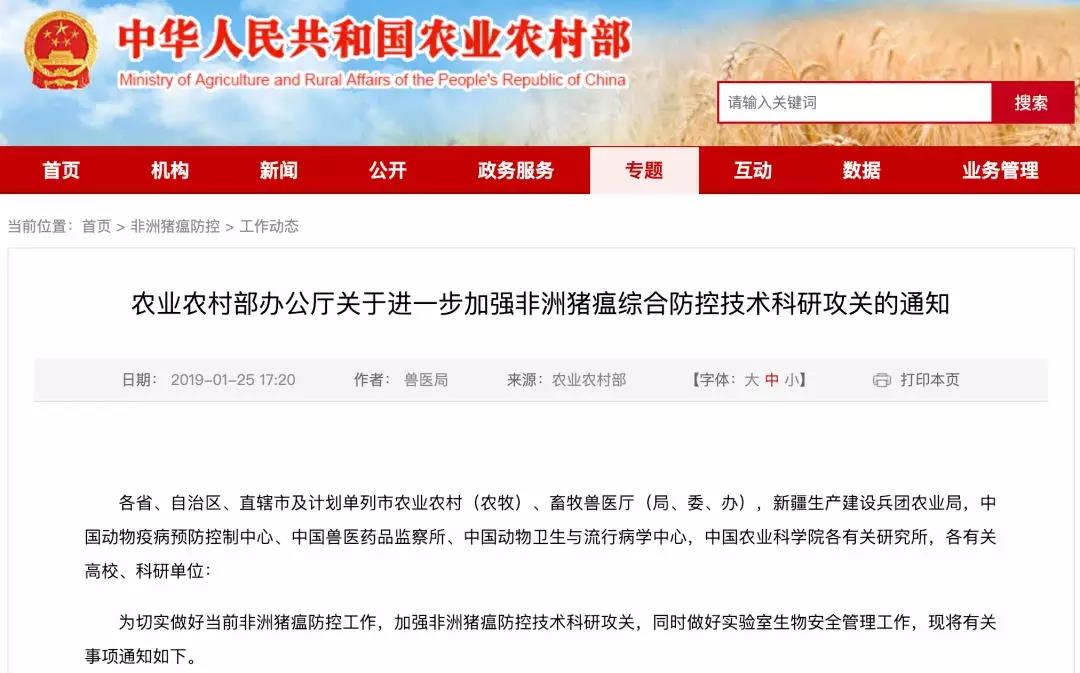 為切實做好當(dāng)前非洲豬瘟防控工作,加強(qiáng)非洲豬瘟防控技術(shù)科研攻關(guān),2019年1月25日,農(nóng)業(yè)農(nóng)村部辦公廳關(guān)于進(jìn)一步加強(qiáng)非洲豬瘟綜合防控技術(shù)科研攻關(guān)的通知,通知要求重點推進(jìn)非洲豬瘟疫苗創(chuàng)制,積極開展技術(shù)合作,各級各類農(nóng)業(yè)科研單位要充分利用相關(guān)高校、科研院所等單位的技術(shù)和硬件條件,聯(lián)合開展技術(shù)攻關(guān),加快研發(fā)進(jìn)程。