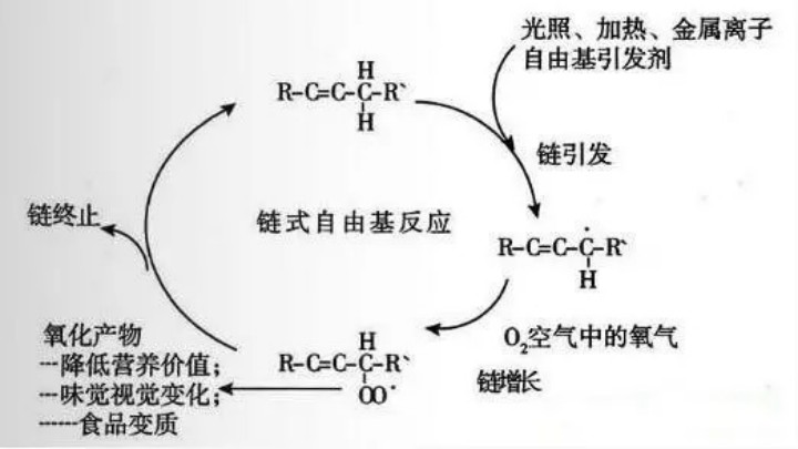 油脂自動氧化是典型的游離基反應(yīng)。此反應(yīng)分為三個階段:鏈的引發(fā)、傳遞和終止。